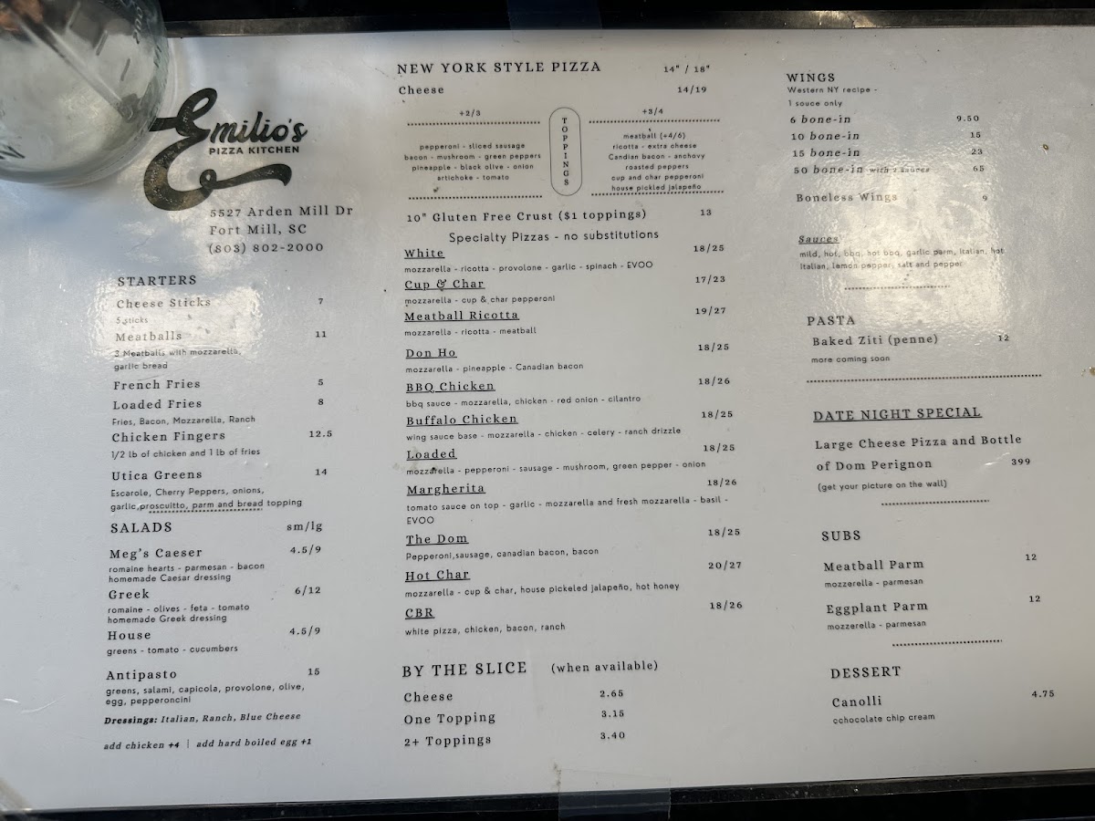 Emilio's Pizza Kitchen offers a straightforward menu centered around familiar, comforting favorites that suit casual lunches, family dinners, or relaxed evenings out. The selection leans into classic and hearty options, including a variety of pizzas ranging from simple cheese and Margherita slices to more indulgent choices like Meatball Ricotta and Pepperoni and Mushroom. Alongside these, you’ll find satisfying bites such as mild buffalo wings, loaded fries, and meatball parm subs, making it easy to mix and match depending on your appetite or occasion.